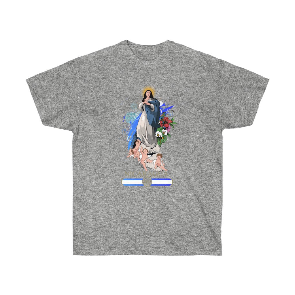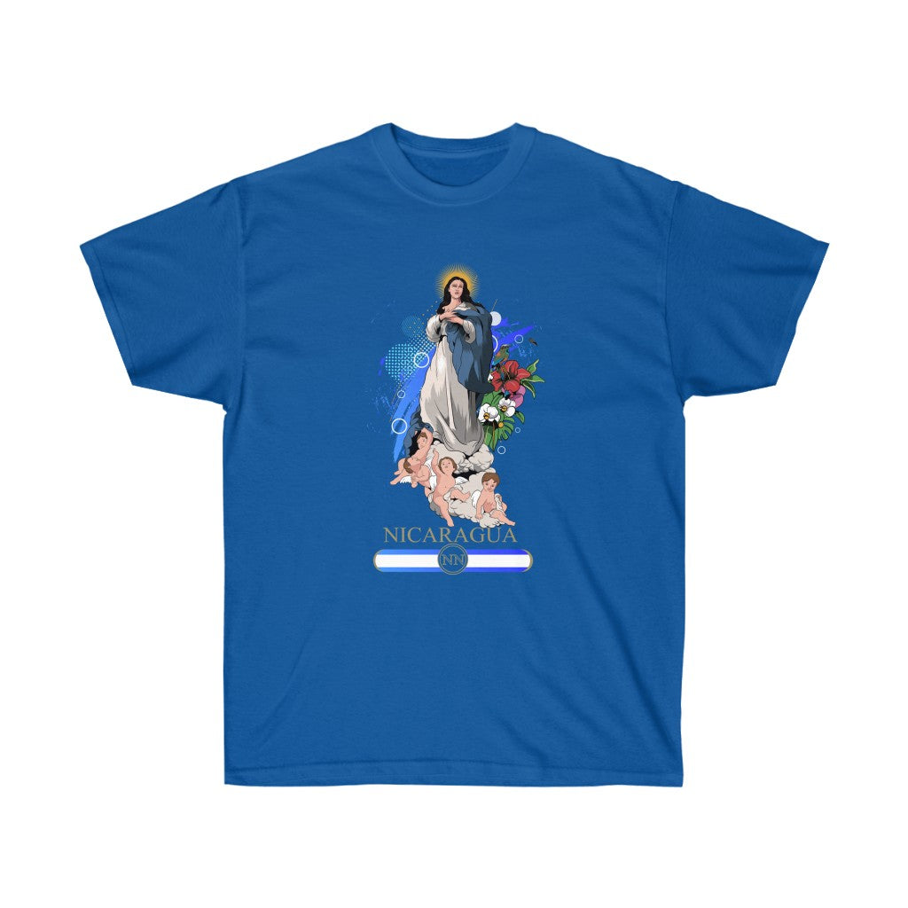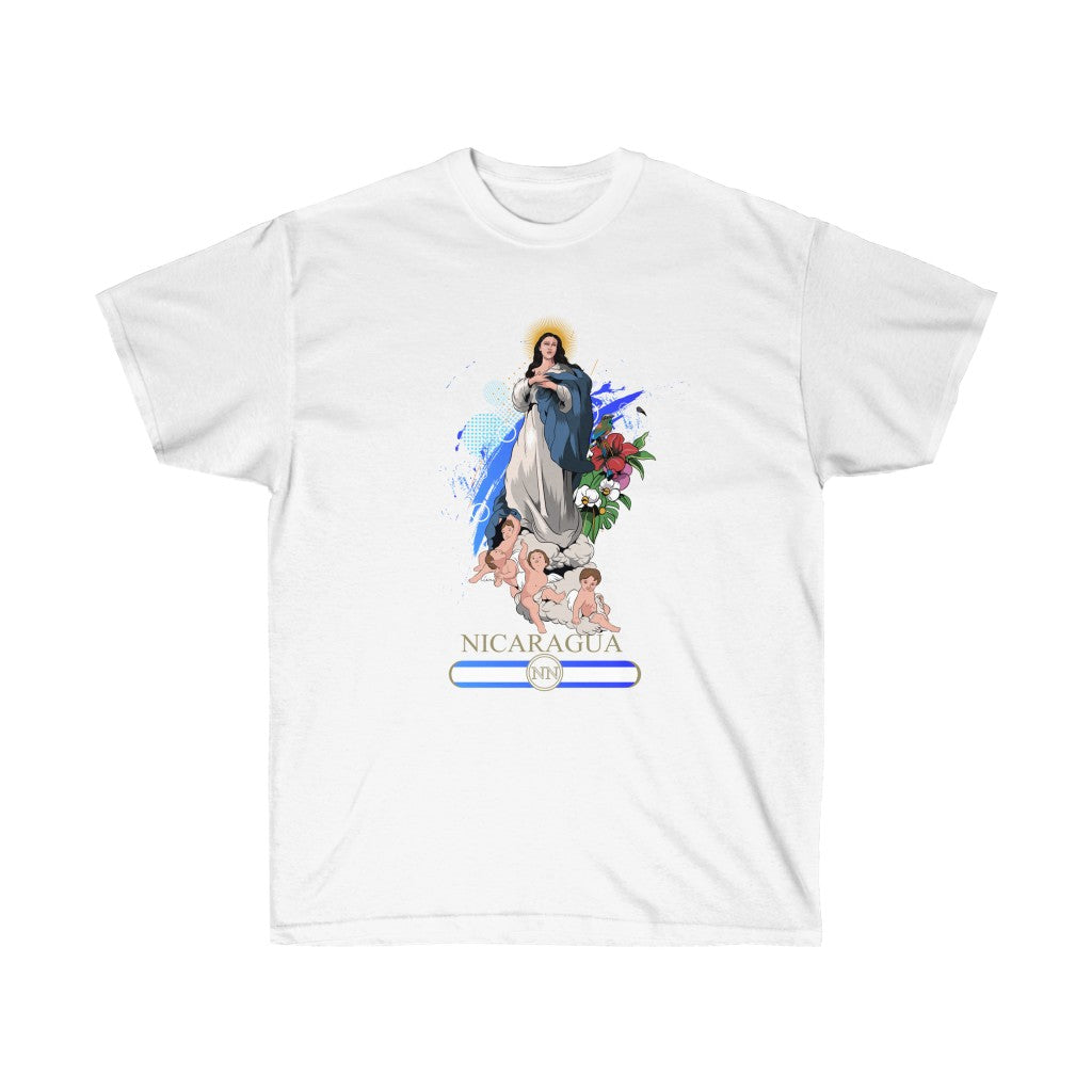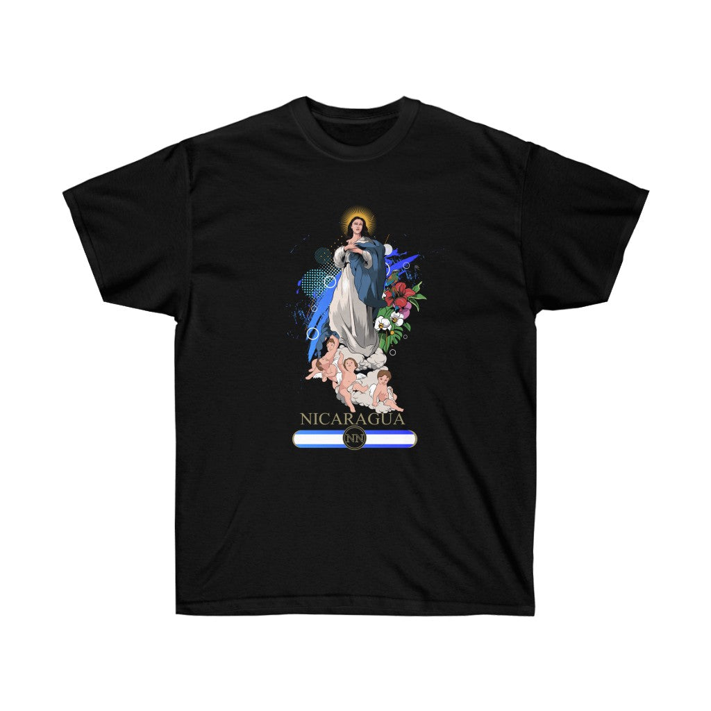 This design of the Virgin Mary from Nicaragua features a fashionable and beautiful look. Angels can be seen by her feet, while the country's native bird, the guardabarranco, and flowers are depicted on the right side of the design.